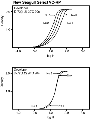 非常にきれいなグラフになっています。軟調ほどISO Speedが速く、中間直線部もきちんと傾きが変化している、というように、号数印画紙の典型といえます。 立ち上がりは急激で、肩部分はゆっくりと変化して最高濃度へ達するという特徴から、Plus-XやNeopan400プレスト、Tri-Xのような、急激に立ち上がって肩部を持つフィルムからプリントするに適しているといえます。